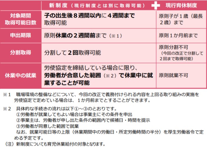 A.主に男性が取得できる出生時育児休業制度が創設され、従来の育児休業も2回まで分割取得できるようになりました。