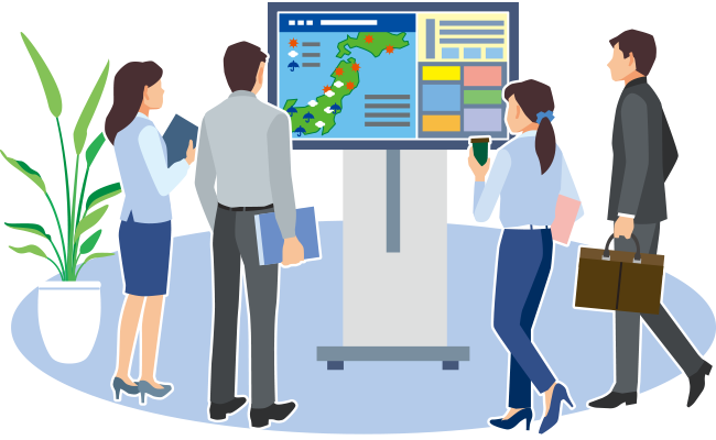 また、ニュースや天気予報などアイキャッチ効果を高める コンテンツは、全国の様々な場所に設置されたデジタルサイネージ・ 大型ビジョン3,500台以上に配信しています。
