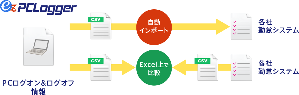 自己申告以外での労働時間の確認・記録が求められる中で、やむを得ず自己申告により把握する場合、客観的な記録との間に著しい乖離がないかをチェックする必要があります。『ez-PCLogger』は、ネットワークに接続されているPCのログオン・ログオフ情報を自動で収集します。集めた情報は柔軟なフォーマット変換機能により、各種勤怠システムと連携し、活用できます。